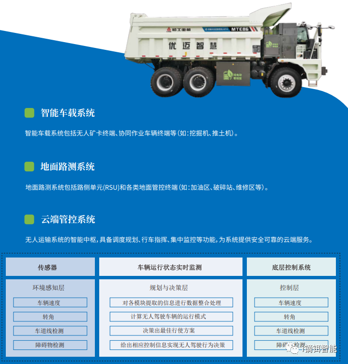 主动防撞预警系统采用先进的多源信息感知融合技术、V2X通信技术、云端监视与大数据分析技术实现矿用卡车的智能防撞、风险预警、驾驶行为评定等安全保障功能。